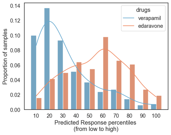These figures demonstrate BioNAV™’s ability to correctly predict the efficacy of existing ALS candidate treatments. BioNAV™ predicts over 80% of ALS patients will be likely non-responders or likely non-responders to verapamil. Similarly, the observed clinical trial outcomes of verapamil were that it is an ineffective treatment for ALS [15]. BioNAV™ also predicts over 50% of the ALS population will either be responders or likely responders to edaravone. This aligns with clinical trial outcomes, where edaravone was observed to be beneficial to ALS patients [16]. BioNAV™ achieved similar estimates using RNA profiling alone. This demonstrates that BioNAV™ can be used to predict the clinical efficacy of future ALS candidate treatments.