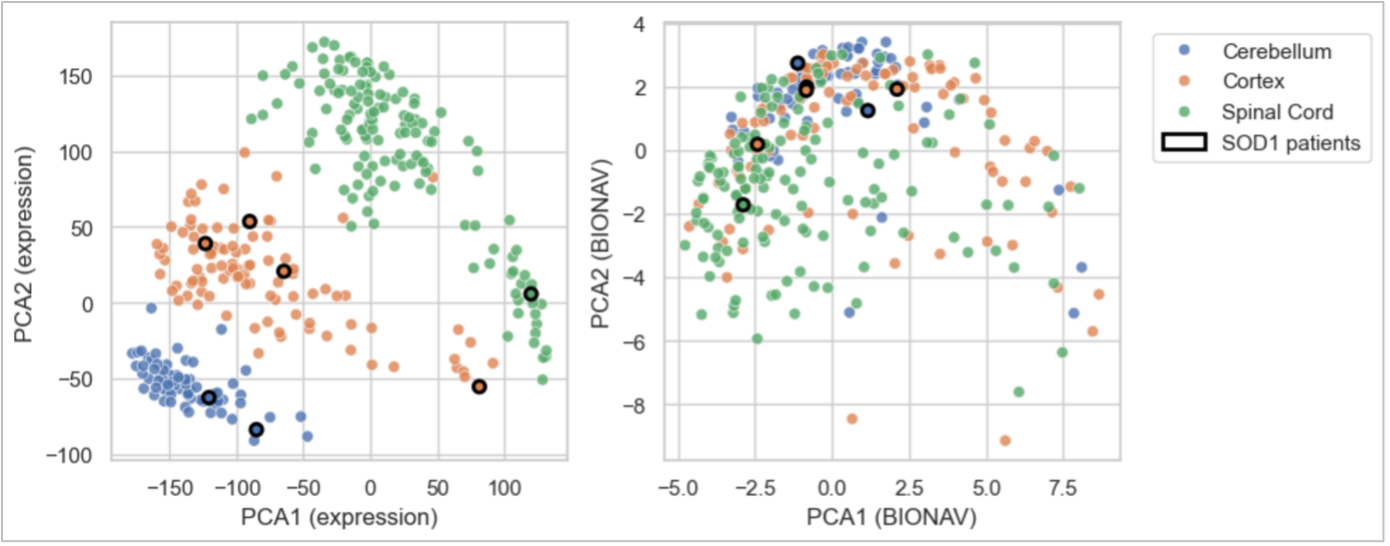 The left figure shows the principal component analysis of raw gene expression across samples from cortex, spinal cord, and cerebellum, where even molecularly similar SOD1 patients remain separated by tissue. In contrast, the BioNAV™ network-based platform (right) transforms these tissue-driven expression signatures into therapeutic pathway-driven representations, where SOD1 samples are now closer to each other. This demonstrates that despite tissue-specific differences in raw expression, the underlying therapeutic response signals are consistent for similar patients, despite the tissue. Importantly, BioNAV™ can detect and extract those cross-tissue molecular mechanisms relevant to ALS biology.