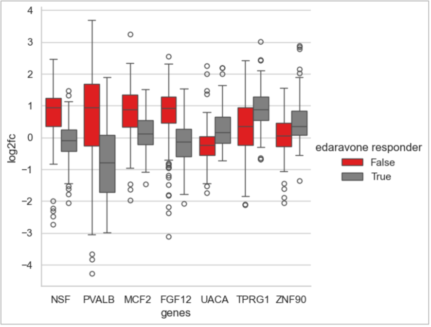 This figure shows a curated set of gene-level indicators that differentiate predicted edaravone non-responders (red) from responders (grey). After BioNAV™ stratifies patients into response groups, analysis identifies the genes most associated with these response differences. Many of these indicators are linked in the literature to neurodegenerative biology and brain-related pathways, and importantly, they emerge consistently across tissues rather than being tissue-specific. This demonstrates how BioNAV™ reveals the mechanistic drivers underlying predicted drug response, enabling clear responder vs. non-responder stratification and highlighting the system-level signals that connect central and peripheral biology.
